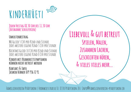 Was: Zugewandt und liebevoll betreuen wir Dein Kind bei uns im Familienverein. Du darfst Dein Kind regelmässig oder spontan am Freitagmorgen zu uns bringen. Eine Anmeldung ist nicht erforderlich. Es sind immer zwei Betreuungspersonen vor Ort.